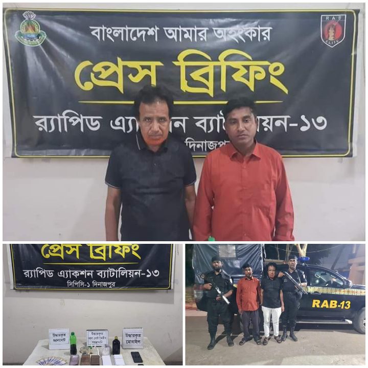 র্যাব-১৩, ক্রাইম প্রিভেনশন কোম্পানী-১ দিনাজপুরের একটি চৌকস আভিযানিক দল গোপন সংবাদের ভিত্তিতে জানতে পারে যে, দিনাজপুর জেলার ষ্টেশন রোডে হোটেল সাহারা আবাসিক এর একটি কক্ষে বিপুল পরিমান জাল টাকা এবং জাল টাকা ছাপানোর সরঞ্জামাদি দিয়ে জাল টাকা তৈরি করছে। উক্ত সংবাদের প্রেক্ষিতে র্যাব-১৩ এর সিপিসি-১ এর আভিযানিক দল গত ১৯ তারিখ দুপুরে সদর পৌরসভাস্থ ষ্টেশন রোড হোটেল সাহারা আবাসিক এর ৩য় তলার দক্ষিন পার্শ্বে ২০২নং কক্ষে অভিযান পরিচালনা করে মোট ৪০ (চল্লিশ)টি জাল একহাজার টাকার নোট, মূল্যমান ৪০,০০০/- (চল্লিশ হাজার টাকা), জাল নোট তৈরির কাজে ব্যবহৃত (রর) ২(দুই) বোতল ৯৬০ গ্রাম তরল কেমিক্যাল আয়োডিয়াম কিউ, ৩৫০ গ্রাম ফিটকিরি, ০৪টি স্বচ্ছ সাদা রংয়ের কাঁচ এবং ০২টি স্বচ্ছ রঙ্গিন কাঁচ, ৪টি প্লাস্টিকের তৈরি সাদা রংয়ের ড্রপার, ১০৩০ পিস দেশীয় একহাজার টাকার নোটের আকারে কর্তনকৃত জাল নোট ছাপানোর জন্য তৈরিকৃত রঙ্গিন ও সাদা কাগজ, ২টি কসটেপ, ১টি মাঝারি আকারের মোমবাতি উদ্ধার করা হয়। ঘটনার সহিত জড়িত ১। মোঃ সুলতান মাহমুদ (৫৫), পিতা- মৃত শফিউদ্দিন মন্ডল, সাং- ওমরপাইল, ৫নং শশরা ইউপি, থানা- কোতয়ালী, আসামী ২। মোঃ মানিক মিয়া (৩৭), পিতা- মৃত শামছুদ্দিন, সাং- রাঘবিন্দপুর, ৯নং হামিদপুর, থানা- পার্বতীপুর, উভয় জেলা- দিনাজপুরদ্বয়কে ঘটনাস্থল হতে হাতে নাতে গ্রেফতার করা হয়।