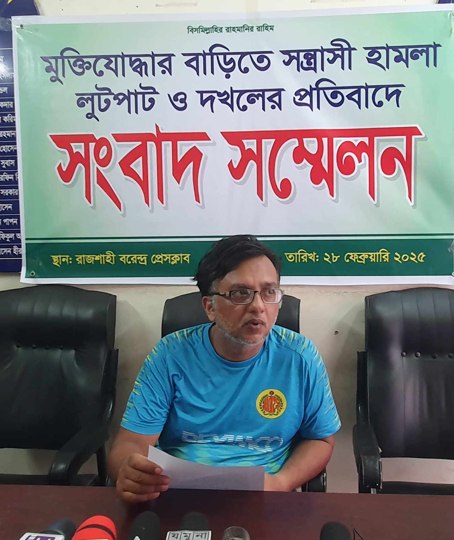 নিজস্ব প্রতিনিধি: রাজশাহী নগরীর চন্ডীপুর প্রেসক্লাবের পেছনে এক মুক্তিযোদ্ধার সন্তান ও তার বসতবাড়িতে জোরপূর্বক হামলা, পরিবারের সবাইকে মারধোর ও ভয়ভীতি দেখিয়ে বসতবাড়ী থেকে বের করে দিয়ে বাড়ী দখল নিয়েছে স্থানীয় একদল সন্ত্রাসী। এমনই অভিযোগ তুলে বাড়ী ফেরত, হামলা-মারধোরের প্রতিবাদ ও সন্ত্রাসীদের বিচার দাবিতে সংবাদ সম্মেলন করেছেন ভূক্তভোগী মুক্তিযোদ্ধার সন্তান।