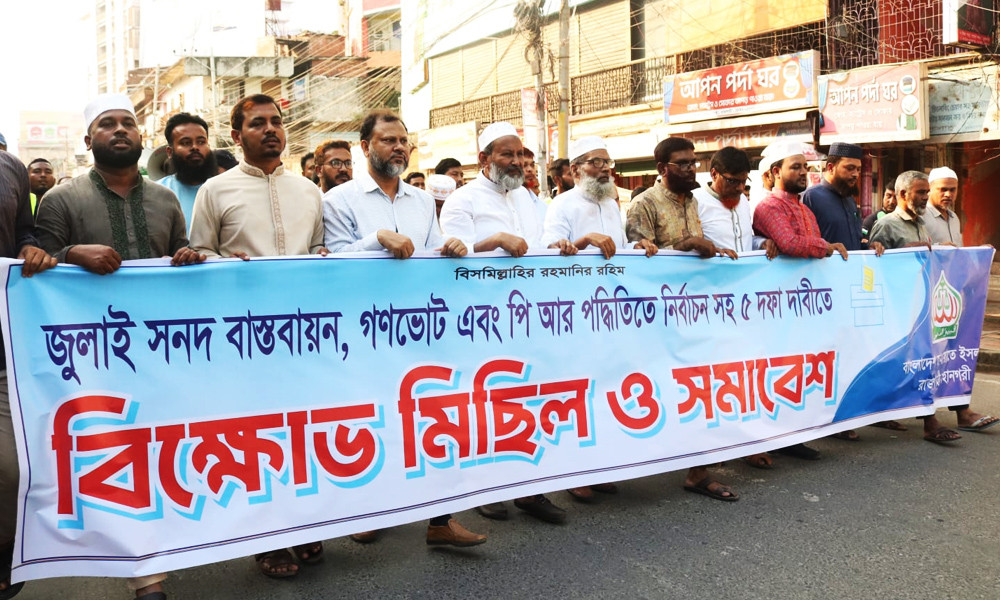 নিজস্ব প্রতিবেদক: জুলাই সনদ বাস্তবায়ন, গণভোটের মাধ্যমে জাতীয় সিদ্ধান্ত গ্রহণ এবং আনুপাতিক প্রতিনিধিত্বভিত্তিক (পিআর) পদ্ধতিতে জাতীয় নির্বাচনসহ পাঁচ দফা দাবিতে রাজশাহীতে বিক্ষোভ সমাবেশ করেছে বাংলাদেশ জামায়াতে ইসলামী। শনিবার (২৫ অক্টোবর) বিকেল ৩টায় রাজশাহী নগরীর গণকপাড়া মোড়ে কেন্দ্রীয় কর্মসূচির অংশ হিসেবে এ সমাবেশ অনুষ্ঠিত হয়। পরে সমাবেশ থেকে একটি বিক্ষোভ মিছিল আলুপট্টি মোড় হয়ে সাহেববাজার, মালোপাড়া প্রদক্ষিণ করে শেষ হয়।