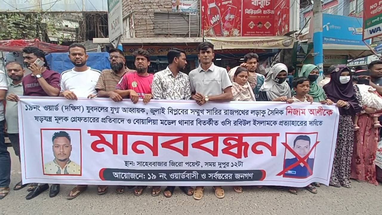 রাজশাহীতে মানববন্ধন: ‘মিথ্যা মামলায় ফাঁসানো হয়েছে’—ওসি প্রত্যাহারের আল্টিমেটাম